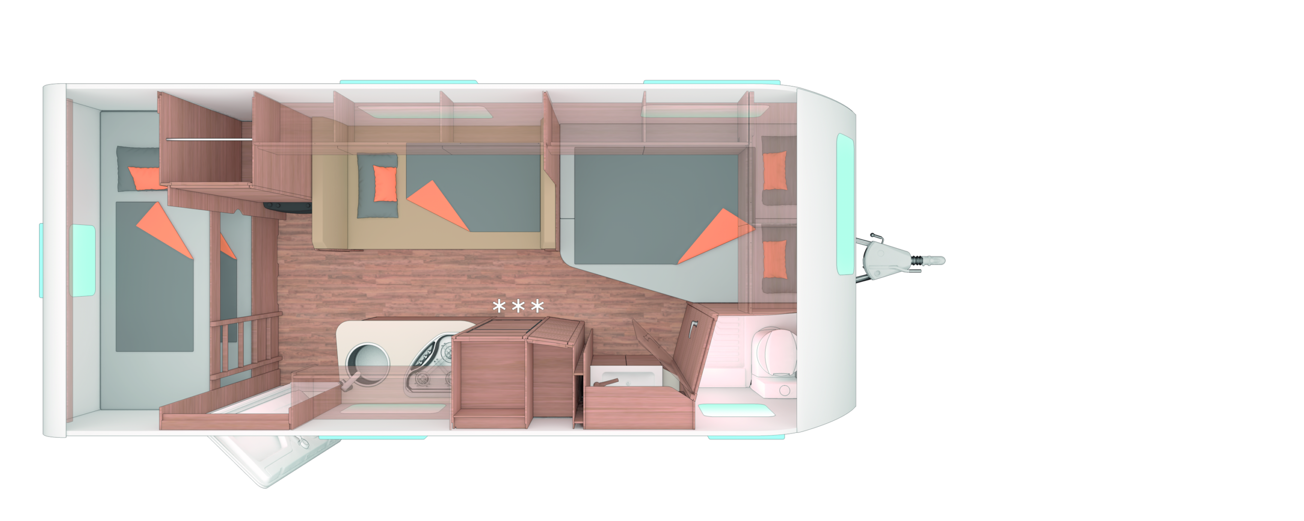 Wohnraumklima, Gasheizung, Warmwasserboiler, Bord Küche, Dusche, Waschbecken, Toilette, Kühlschrank u. Gefrierschrank, Markise 400×250 cm, Fahrradträger für 2 Fahrräder, Standklimaanlage, mit Mover zum einfachen Einparken